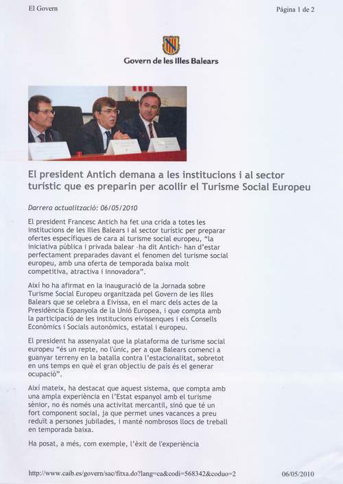 El president Antich demana a les institucions i al sector turístic que es preparin per acollir el Turisme Social Europeu