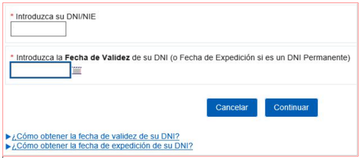 - Si se trata de un DNI: indica la fecha de validez o la de expedición. En caso de DNI permanente (sin periodo de validez) solo es posible utilizar la fecha de expedición.