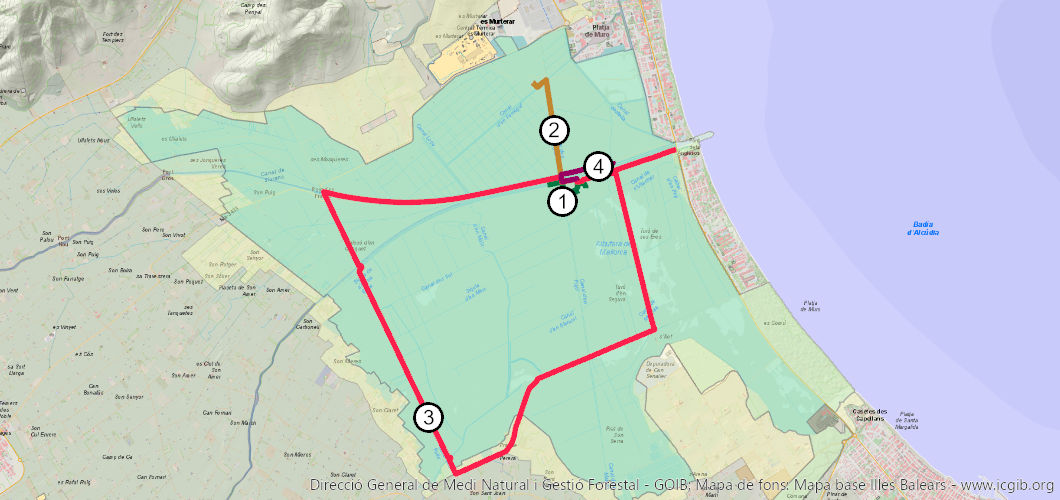 Descripción: Este itinerario recorre, junto con el de Sa Roca, la parte central del Parque, una de las más diversas y ricas. Es recomendable hacerlo con calma, con constantes y largos paros en los puntos de interés (acechos, puentes, canales)