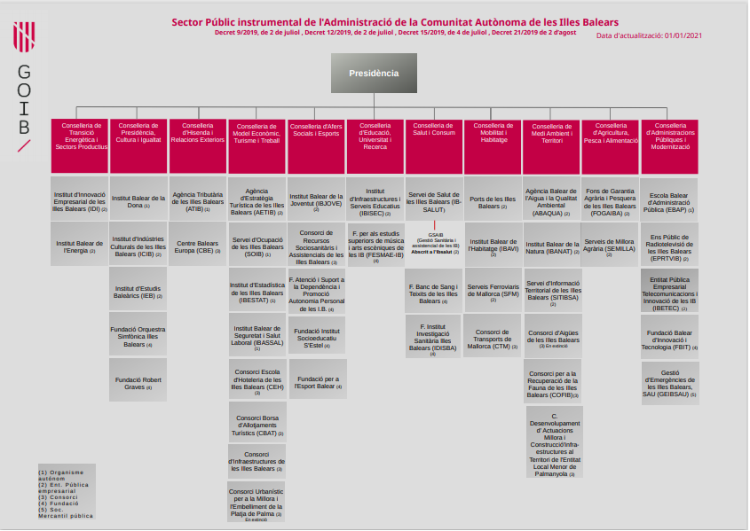 D'acord amb el que disposa l'Estatut d'Autonomia, la Llei 1/2019, de 31 de gener, del Govern de les Illes Balears i la Llei 3/2003, de 26 de març, de règim jurídic de l'Administració de la Comunitat Autònoma de les Illes Balears, correspon al president determinar la composició del Govern i configurar l'estructura de l'Administració de la Comunitat Autònoma de les Illes Balears