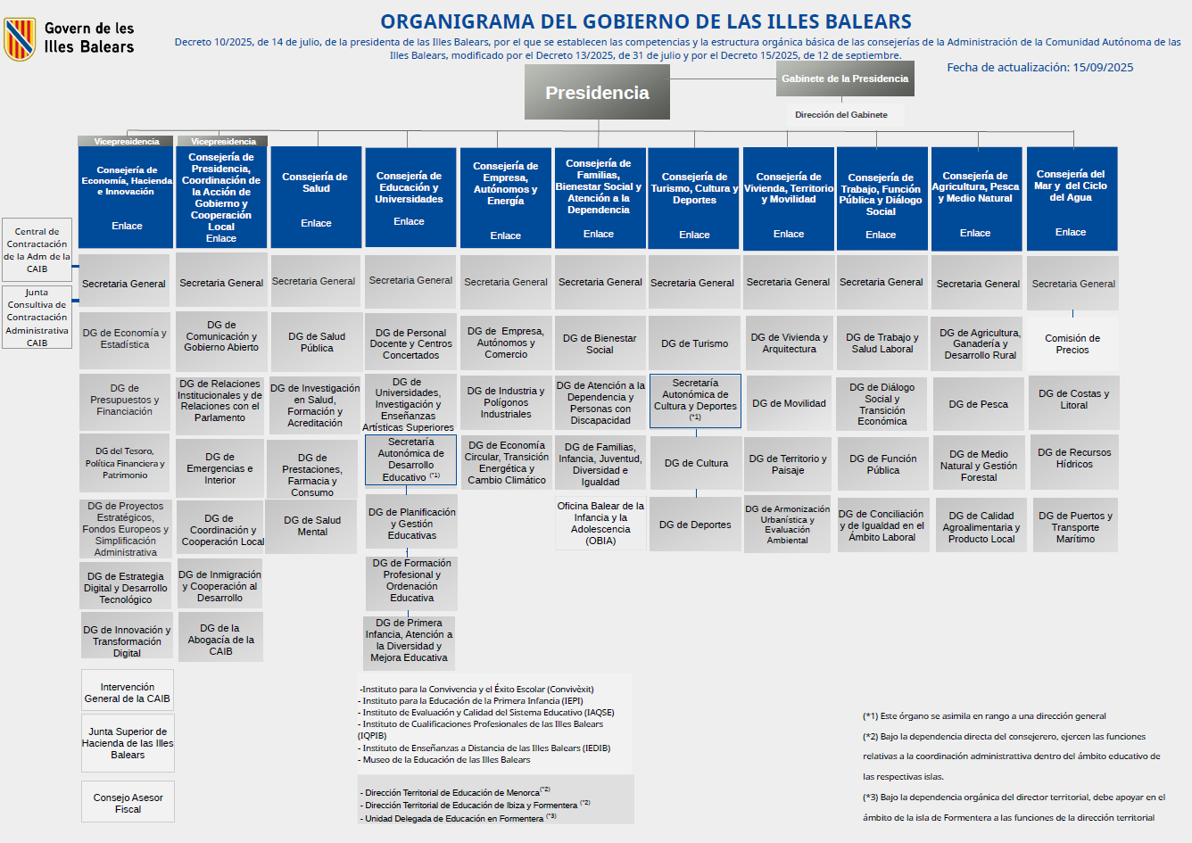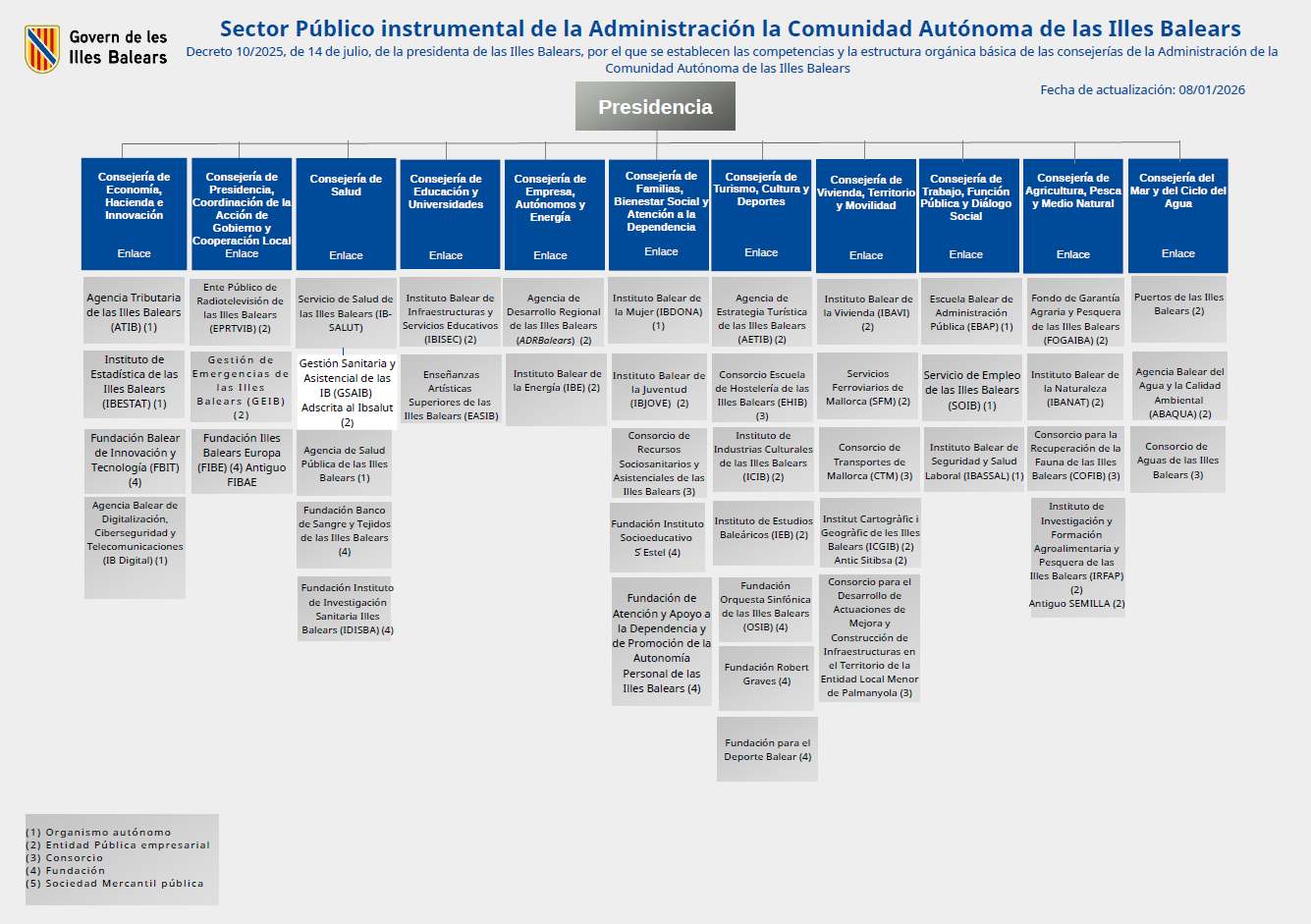 - Decreto 10/2025, de 14 de julio, de la presidenta de las Illes Balears, por el que se establecen las competencias y la estructura orgánica básica de las consejerías de la Administración de la Comunidad Autónoma de las Illes Balears