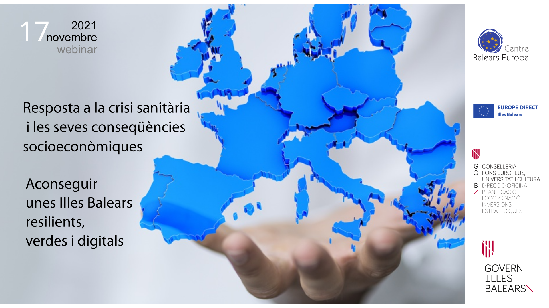Jornada informativa per donar a conèixer les iniciatives, recursos, instruments i fons que ha posat en marxa la Unió Europea (Next Generation EU, Mecanisme de Recuperació i resiliència, fons REACT-UE i Fons Estructurals i d'Inversió), així com l'estratègia de l'Estat espanyol i del Govern de les Illes Balears (Pla de Recuperació, Transformació i Resiliència / Pla d'Inversions Estratègiques IB 2030) per donar resposta a la crisi sanitària provocada per la pandèmia COVID 19.Es pretén fer arribar la informació sobre la posta a disposició dels Estats Membres/Regions de la UE dels Fons Europeus, fent incidència especial a la programació de la Política de Cohesió per al període 2021-2027 i remarcar el destí i impacte previst a les Illes Balears per a reparar els mals causats per la pandèmia.