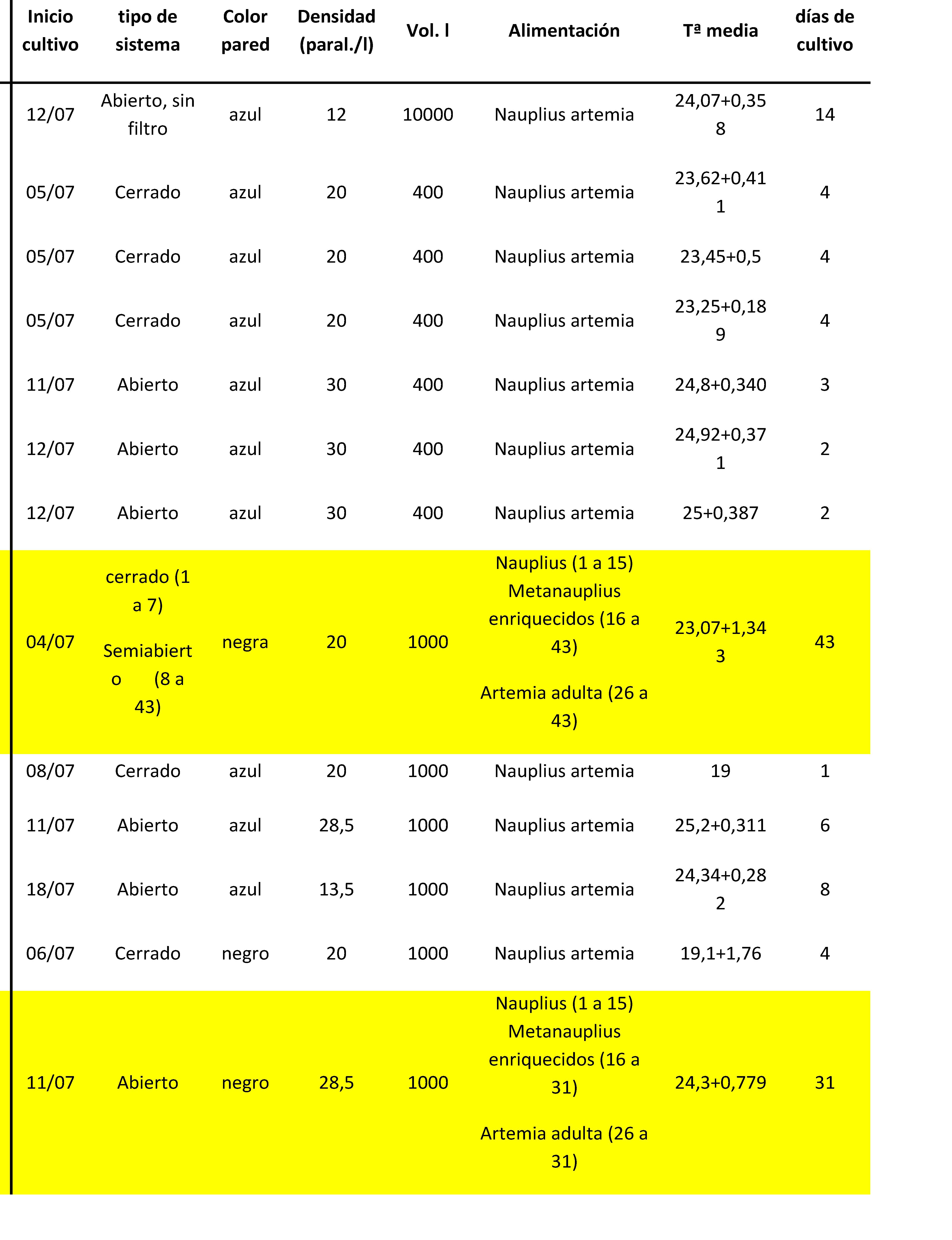 Cada día se comprobaba la presencia de larvas. A partir del día 7 no se observan larvas, pero se mantiene el mesocosmos como fuente de Artemia para los tanques de cultivo intensivo.