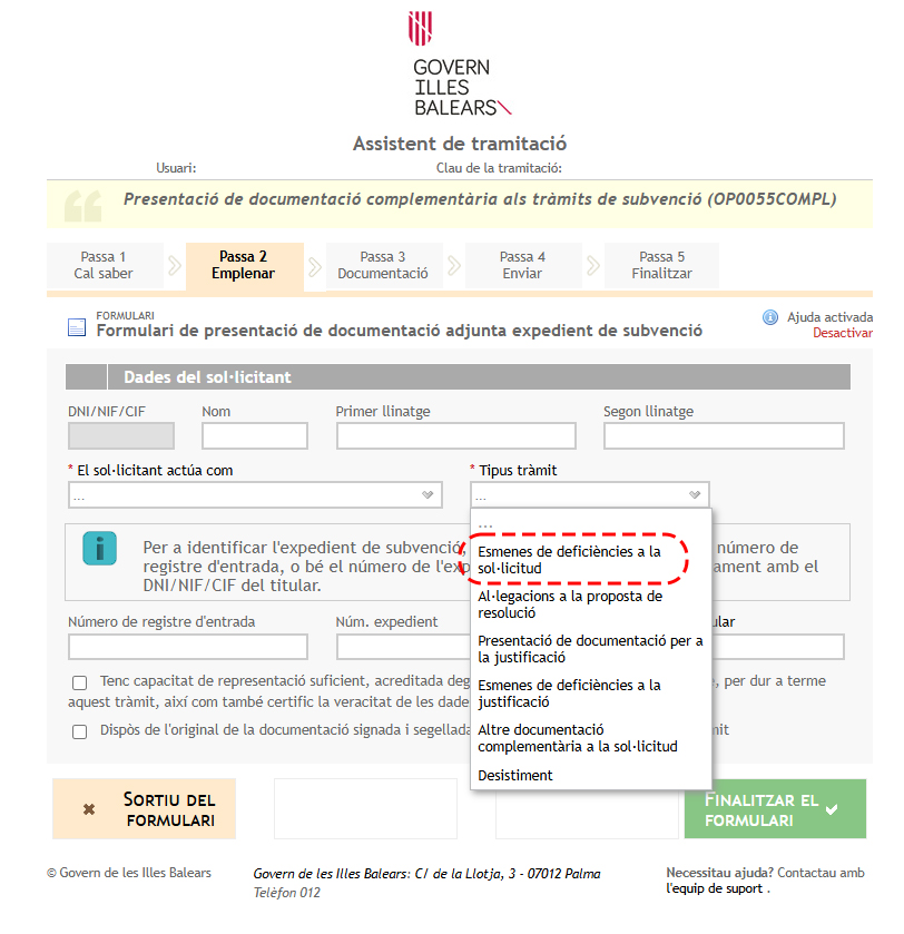 * Per esmenar deficiències de sol·licitud heu d'entrar en el tràmit telemàtic de justificació i seleccionar "Esmena de deficiències a la sol·licitud" a l'apartat "Tipus de tràmit".