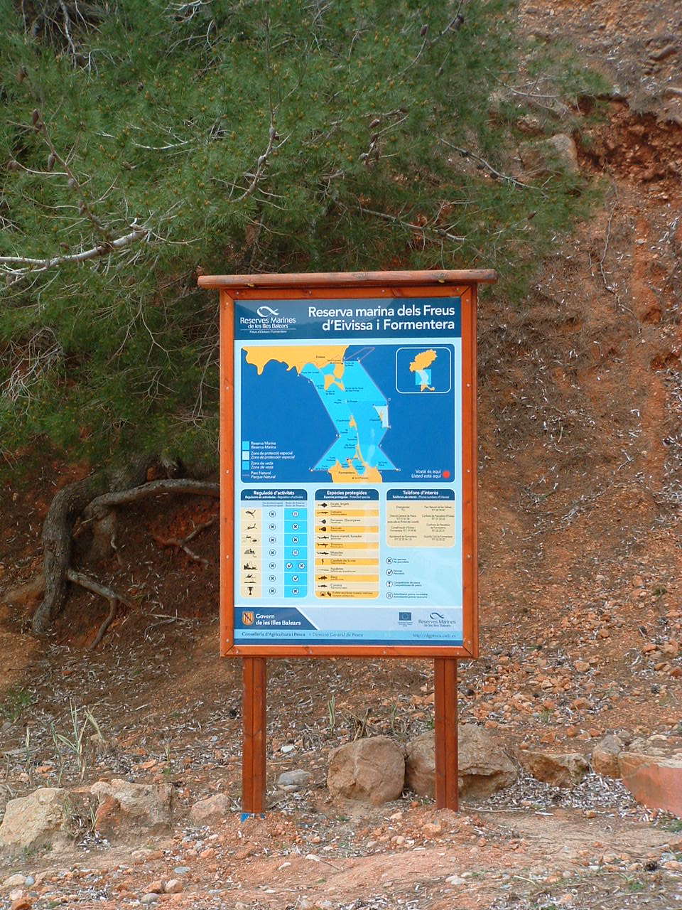 Panel informativo colocado en Bol Nou, dentro de la Reserva Marina de los Freus d'Eivissa i Formentera.