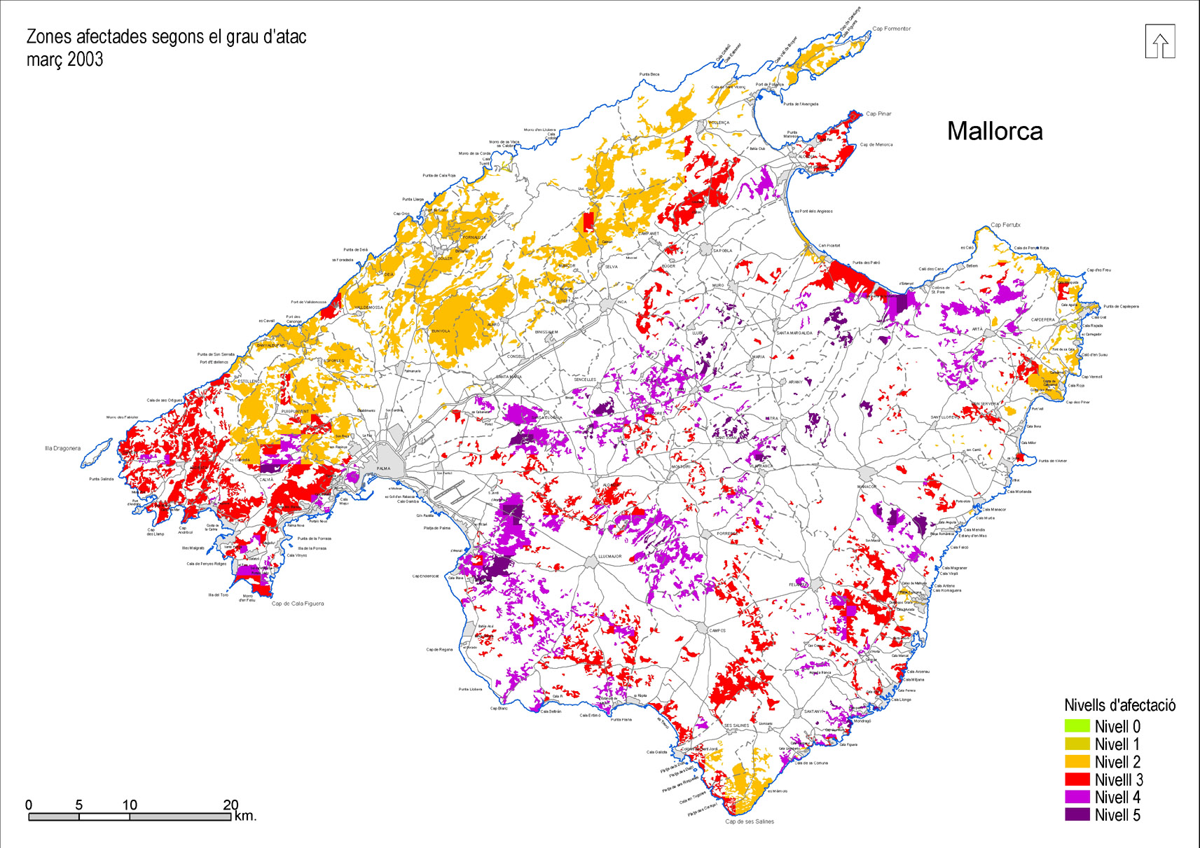 Mapes d'afectació de Paysandisia archon a Mallorca i Menorca