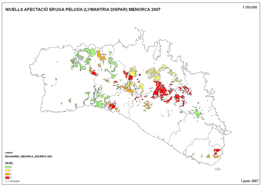 Mapa d'afectació de Lymantria a Menorca - 2007