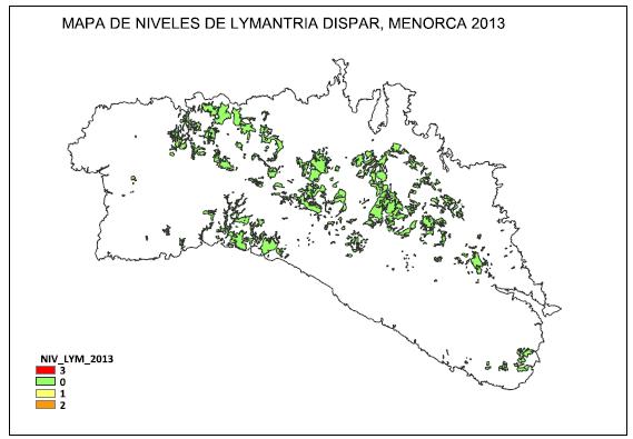 Mapa d'afectació de Lymantria dispar a Menorca - 2013