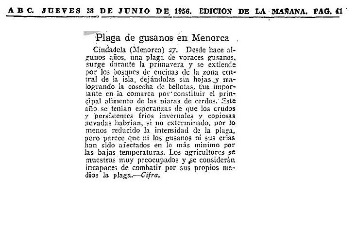 Notícia publicada al diari ABC, dijous 28 de juny de 1956, a la pàgina 41 de l'edició del matí. Presumiblement fa referència a Lymantria dispar.