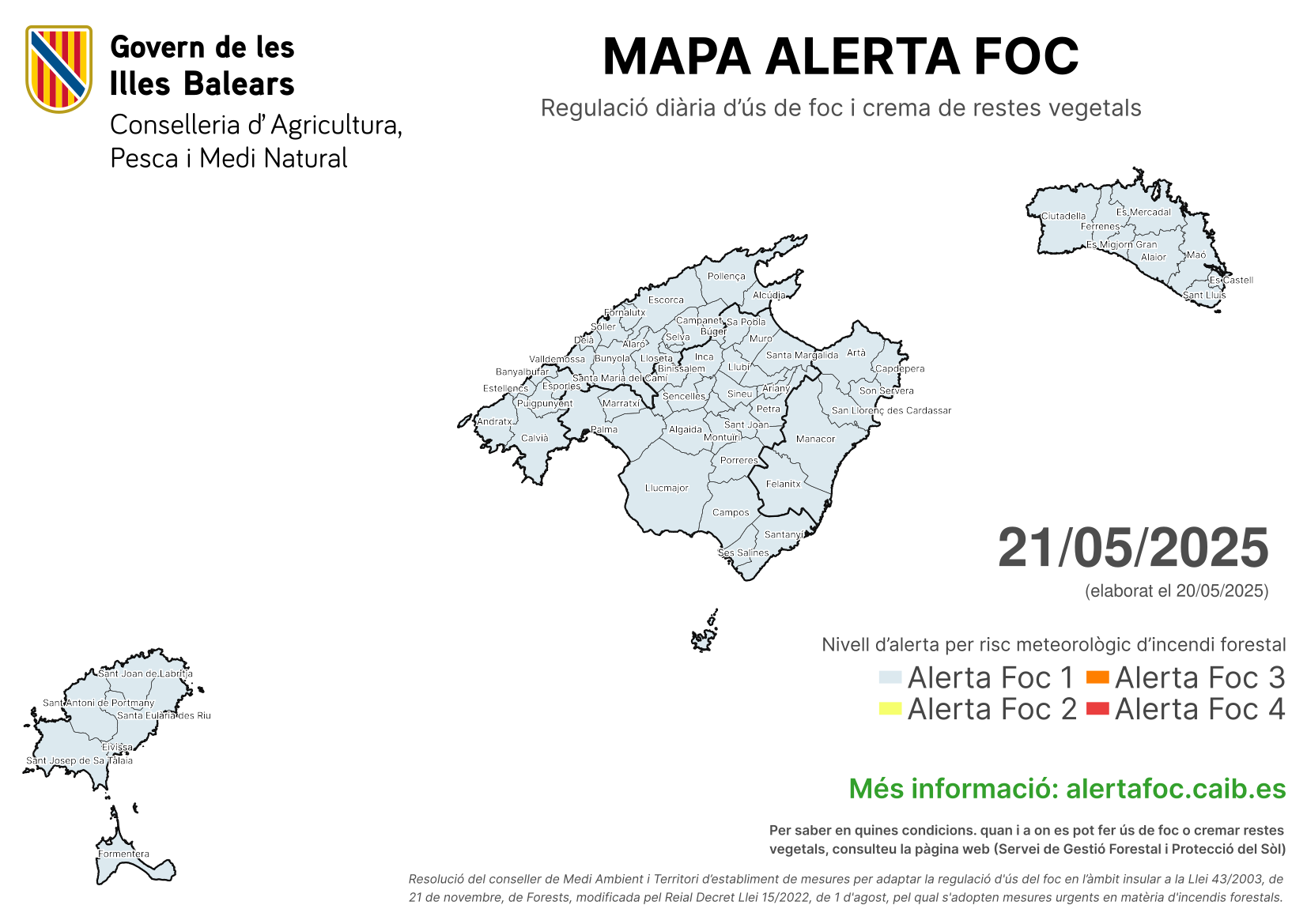 Tots els dies de l'any, s’estableixen mapes diàris informatius del nivell d’alerta (Alerta Foc) per risc meteorològic d'incendi forestal existent en l'àmbit de les Illes Balears. Aquests mapes determinen, en part, la regulació diària de la crema de restes vegetals o ús de foc, complementàriament a la ja establerta en funció del tipus de terrenys o època on es vol fer aquesta. Del nivell Alerta Foc 1 a Alerta Foc 4 s'indica el perill d'incendi forestal, de menor a major grau.