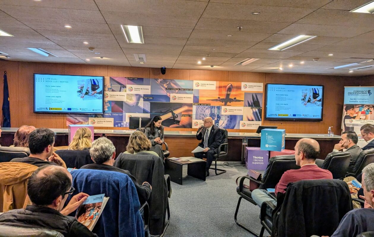 La jornada també va comptar amb la participació d’alumnes, docents i representants de centres educatius, i va incloure testimonis de joves que han viscut l’experiència de l’FP dual intensiva. Un dels moments centrals de l’esdeveniment va ser la conversa que varen mantenir Maria Isabel Salas i Josep Lluís Aguiló, vicepresident de la Cambra i president de la Comissió de Formació, en què varen analitzar, entre d’altres aspectes, els desafiaments i les oportunitats que planteja la nova Llei d’FP.